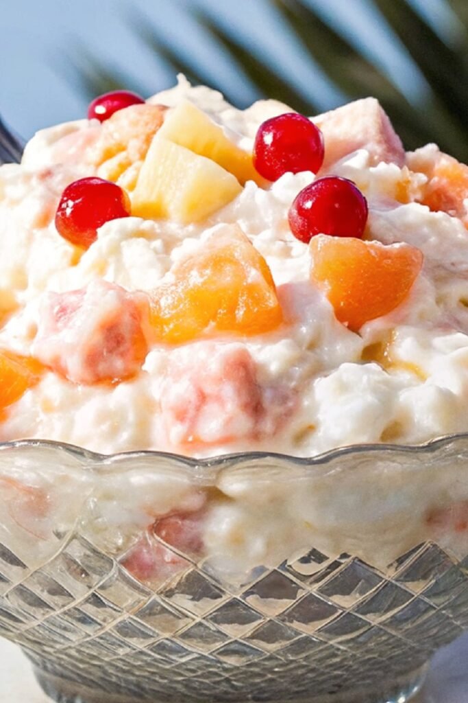 - Fold in the Fruit: Gently add the pineapple, mandarin oranges, and cherries. Fold slowly so the fruit stays intact and colorful.