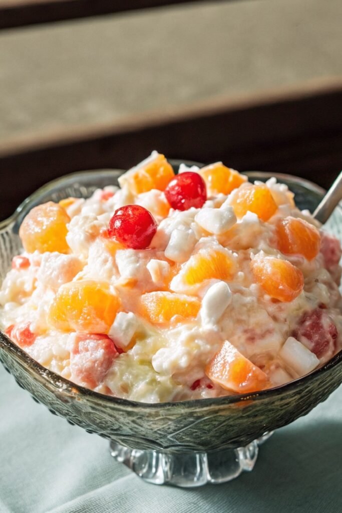Ambrosia salad fits perfectly on holiday tables, summer picnics, and casual dinners. It pairs well with grilled foods and rich main dishes since it feels light and refreshing.