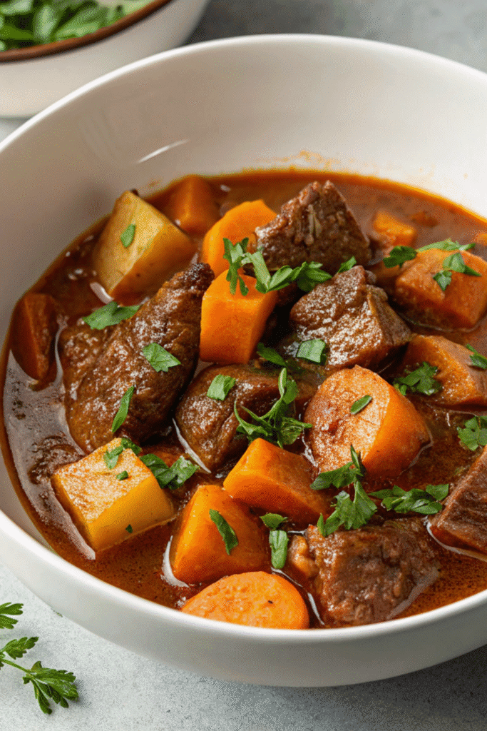 For gatherings, I sometimes ladle the stew into individual bowls and top with homemade herbed dumplings, which makes the dish feel extra cozy and festive. On weeknights, I keep it simple with bread straight from the oven. Either way, it always brings comfort to the table.