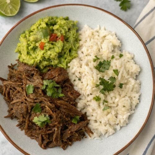 Barbacoa beef with cilantro lime rice and guacamole feels like comfort food with a fresh twist. The beef is rich, juicy, and layered with flavor, while the rice and guacamole lift the plate with brightness and creaminess. Together, it’s a meal that checks every box—savory, tangy, spicy, and refreshing.