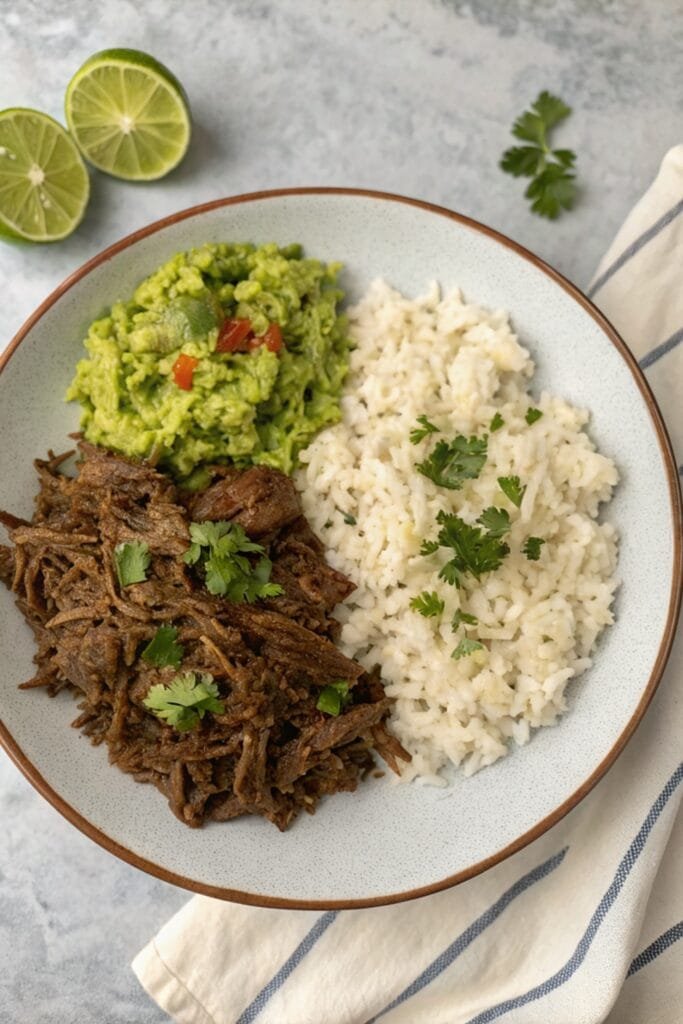 Serve shredded barbacoa beef over a bed of cilantro lime rice, with guacamole on the side or on top. Add extra lime wedges and fresh cilantro as garnish for a colorful plate.