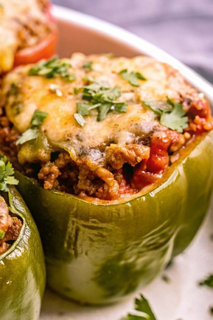 Spoon the beef mixture into each pepper until full. Press gently to pack the filling, but don’t overfill. Sprinkle shredded cheddar cheese generously on top of each stuffed pepper.