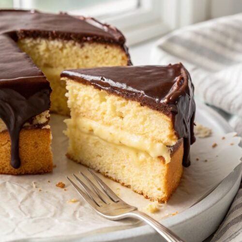 Boston Cream Pie tastes best slightly chilled, which helps the cream stay firm and neat. I like serving slices with fresh berries on the side for a light contrast. A cup of coffee or tea pairs beautifully with the creamy filling and chocolate top.