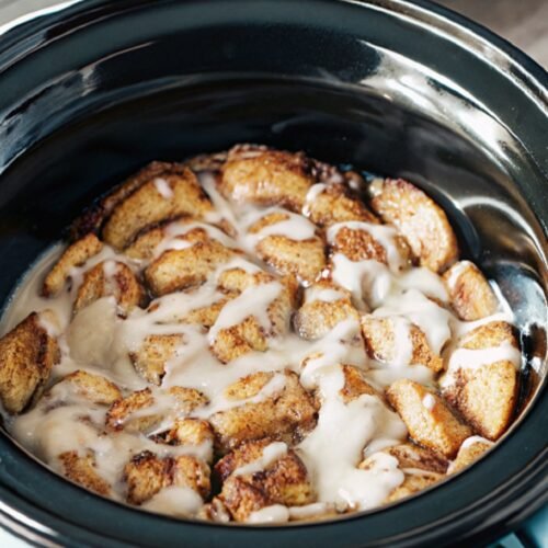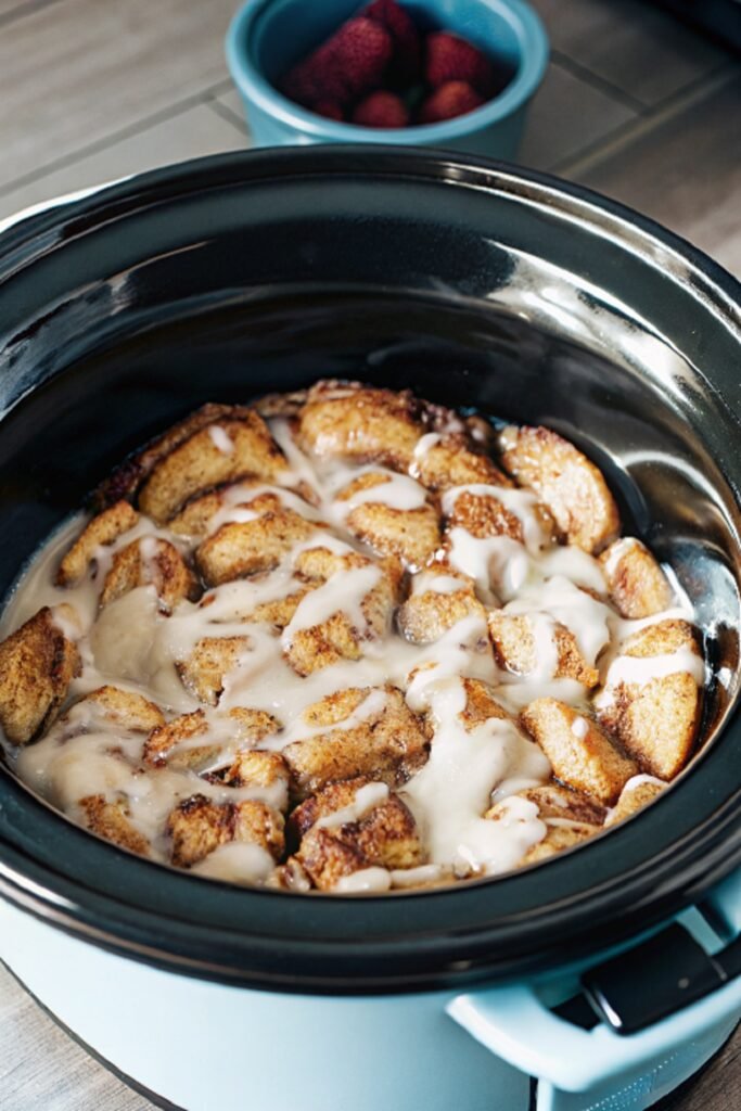 Once the casserole is slightly cooled, drizzle the glaze over the top. Serve warm, either directly from the crockpot or transferred to a serving dish.