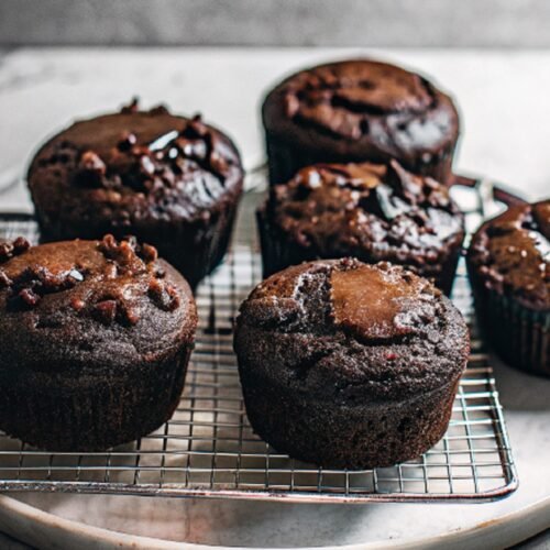 If serving guests, arrange the muffins on a platter with fresh berries and whipped cream. The bright fruit balances the deep chocolate taste and adds a fresh, colorful touch to the table.