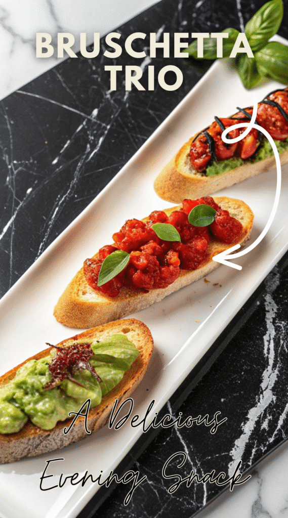 Bruschetta Trio makes a perfect starter for dinner parties, casual gatherings, or cozy evenings. Serve it with sparkling water, lemonade, or a chilled drink for a balanced snack.