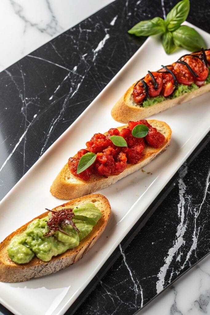 Arrange your toasted bread on a platter. Spoon each topping onto a few slices — tomato basil, avocado, and roasted pepper. Drizzle with a little olive oil or balsamic glaze if desired. Serve right away while the bread is still slightly warm.