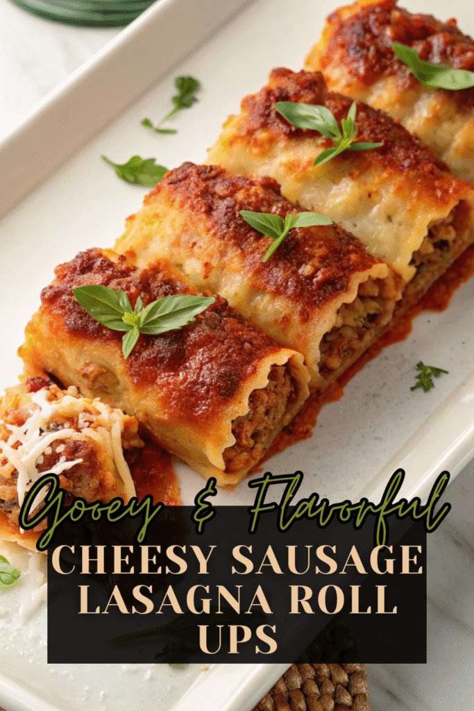 Cheesy sausage lasagna roll-ups deliver hearty comfort in a playful presentation.
