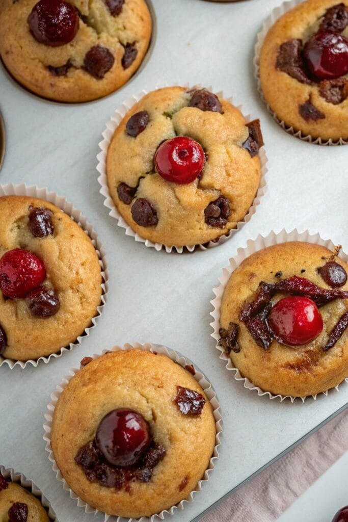 Serve the muffins while still slightly warm so the chocolate chips stay melty and the cherries burst with flavor.
