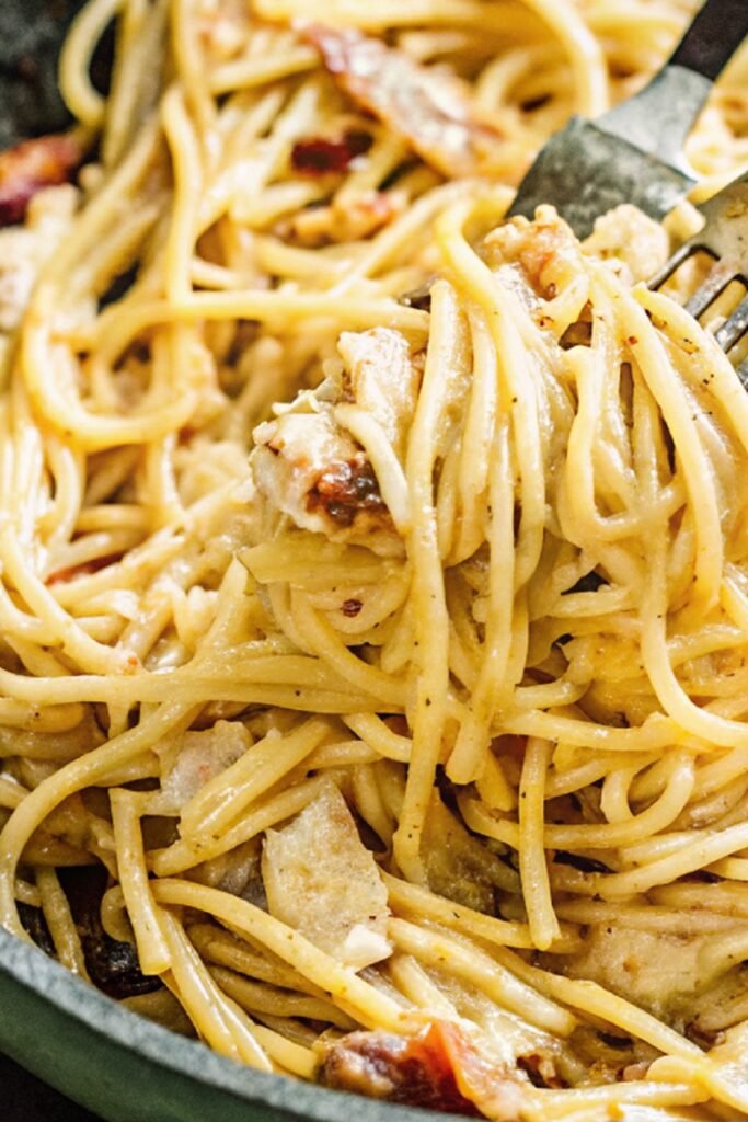 This Chicken Carbonara recipe is my family’s favorite comforting dinner. Adapted from my classic carbonara, it’s rich, silky, and entirely cream-free.