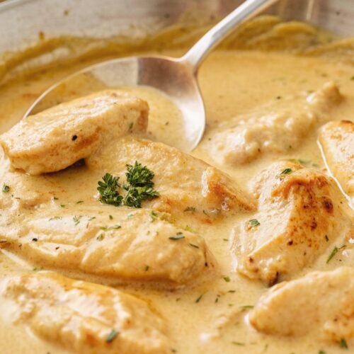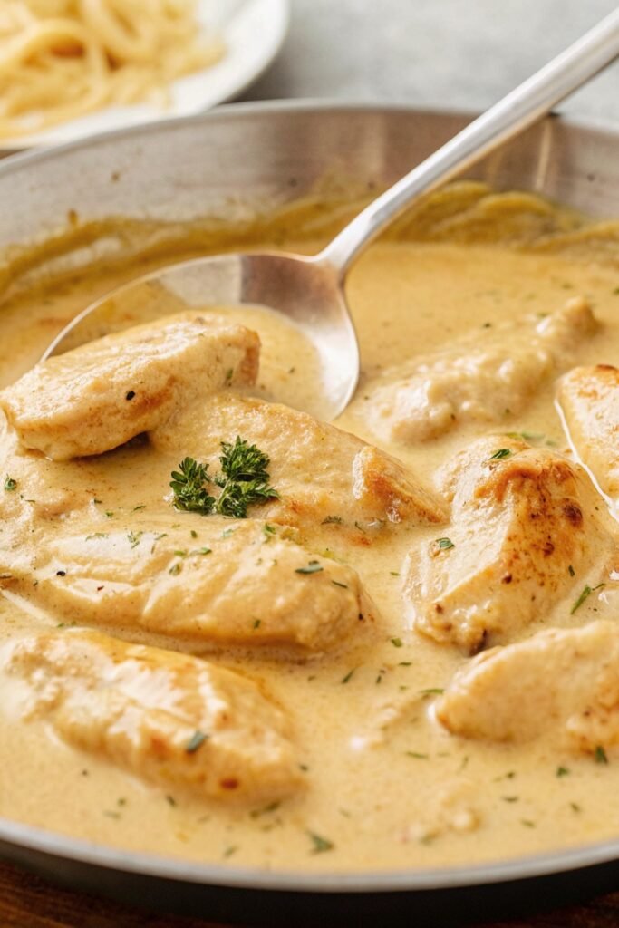 I sear the seasoned chicken right in the pan to lock in the spice, then add heavy cream and butter so everything simmers together and the sauce turns luscious and thick.