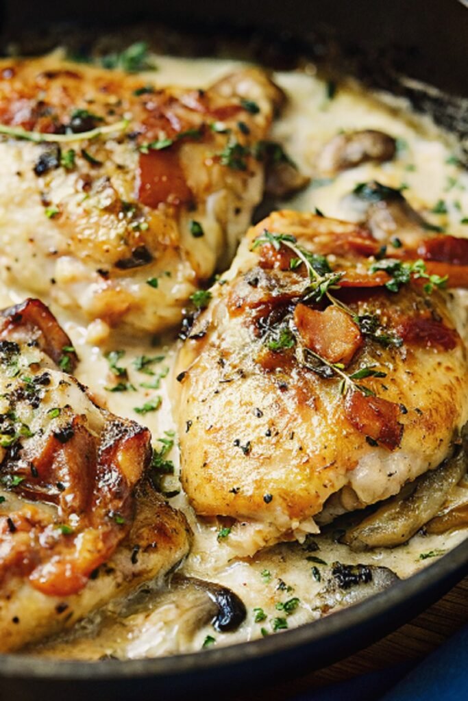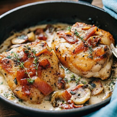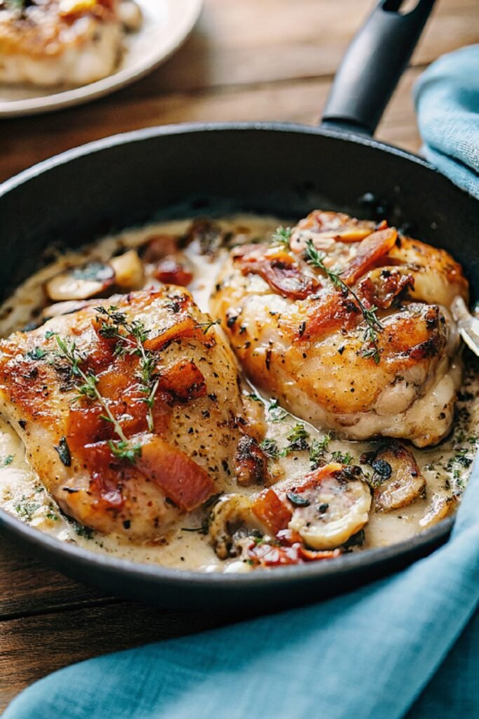 Chicken Thighs with Creamy Bacon Mushroom Thyme Sauce feels rich, comforting, and satisfying every time. Crispy chicken paired with a creamy sauce brings simple ingredients together in the best way. I love how this dish turns an ordinary evening into something cozy and relaxed. It earns a regular spot on the dinner table once you try it.