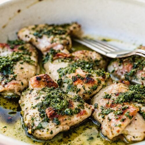 This is a one pan Chimichurri Chicken dish inspired by classic Argentine flavors – except we’re keeping it simple for weeknights today! You’ll love the herb-forward flavour and the homemade green sauce that I expect to show off again very, very soon.