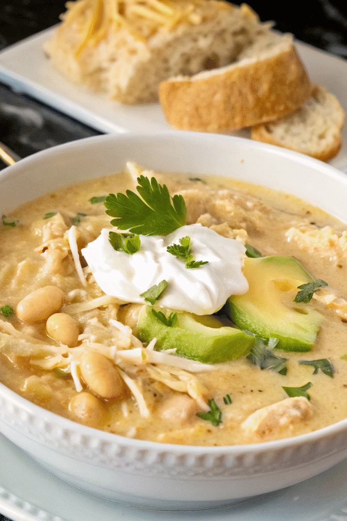 Creamy White Chicken Chili pairs perfectly with warm cornbread, crusty garlic bread, or even a simple green salad. If you’re hosting, serve it in large mugs with a small toppings bar on the side—think shredded cheese, lime wedges, and tortilla strips.
