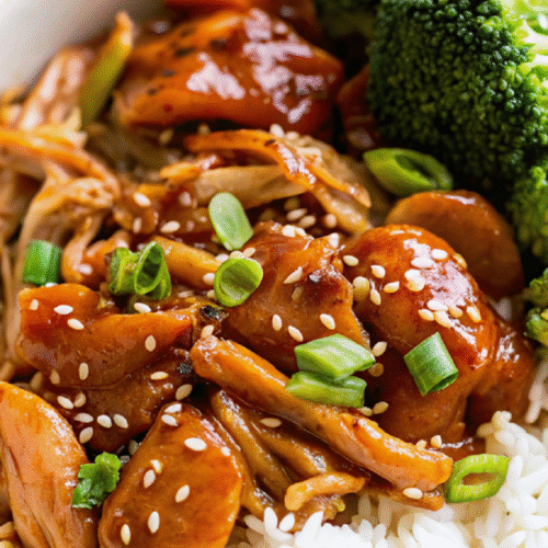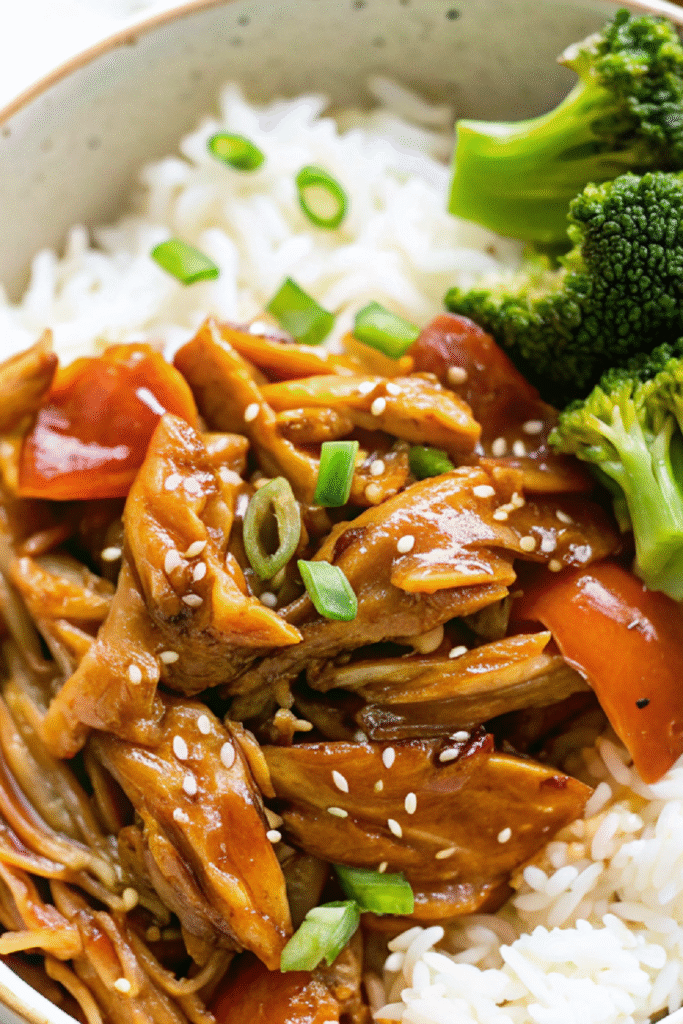 Return the shredded chicken to the crock pot and stir until it’s fully coated with the thickened sauce. Spoon it over bowls of fluffy rice and top with sesame seeds, green onions, or steamed vegetables for a complete meal.