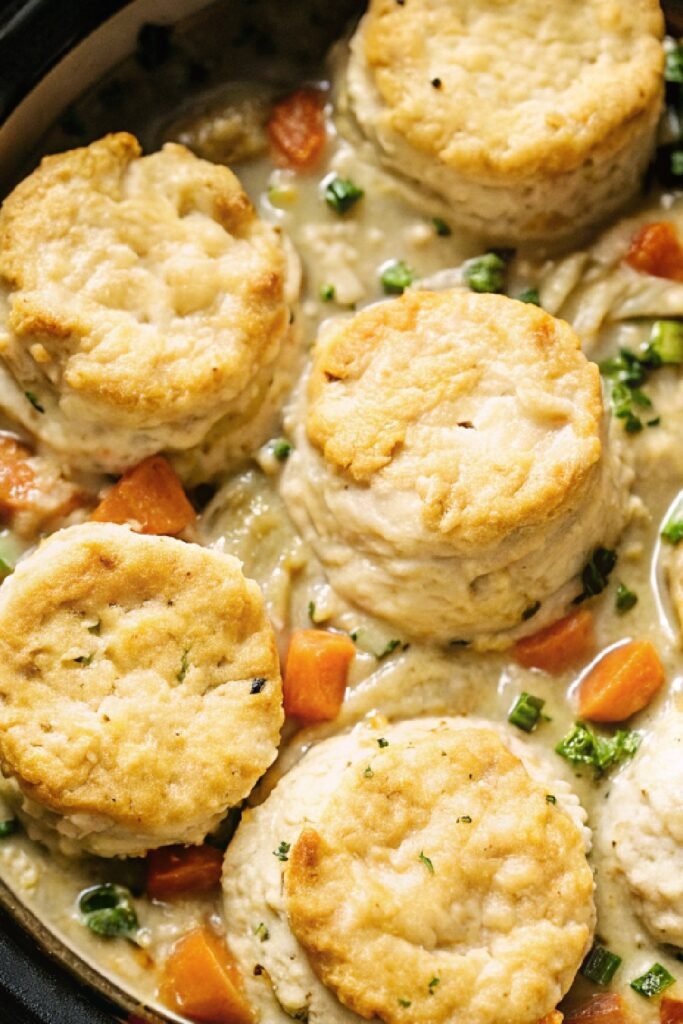 Fluffy biscuit topping: Soft biscuits on top soak up the creamy filling and add a satisfying texture to each bite.