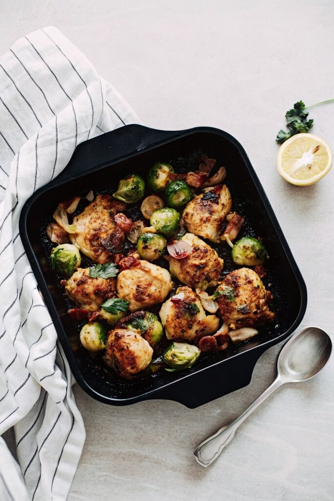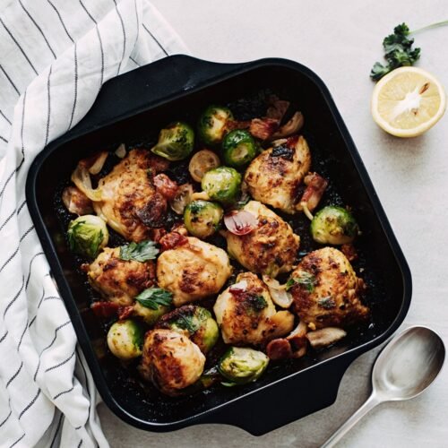 This is the BEST Easy Baked Chicken, packed with flavor from savory bacon and Brussels sprouts and ready in less than an hour! It’s the perfect simple and complete recipe for a weeknight dinner that the whole family will love.