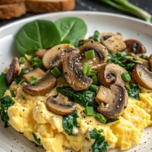 Easy spinach and mushroom scrambled eggs create a wholesome breakfast that feels both satisfying and nourishing. Fluffy eggs get cooked slowly until soft and creamy, then folded together with tender mushrooms and fresh spinach leaves. Each forkful delivers earthy flavor from the mushrooms and a bright green freshness from the spinach, all balanced by the richness of the eggs. It’s the kind of dish that turns a quick morning meal into something that feels complete and comforting.