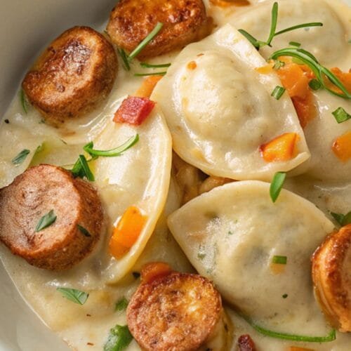 This dish takes classic pierogies and turns them into a hearty, satisfying one-pan meal that’s creamy, flavorful, and incredibly easy to pull together. Tender pierogies simmer alongside browned turkey sausage, onions, and peppers, all tossed in a velvety cream sauce that coats everything beautifully. The combination of pillowy dumplings with savory sausage and fresh vegetables makes this recipe perfect for busy weeknights when you want something that tastes like comfort but doesn’t demand too much effort.