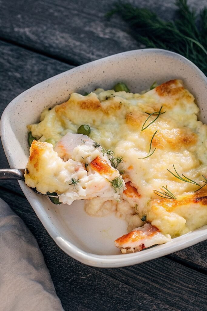 - Assemble the Pie: Spoon the fish filling into a baking dish and spread it evenly. Gently layer the mashed potatoes over the top, smoothing it with a spoon. Add soft peaks for extra texture during baking.