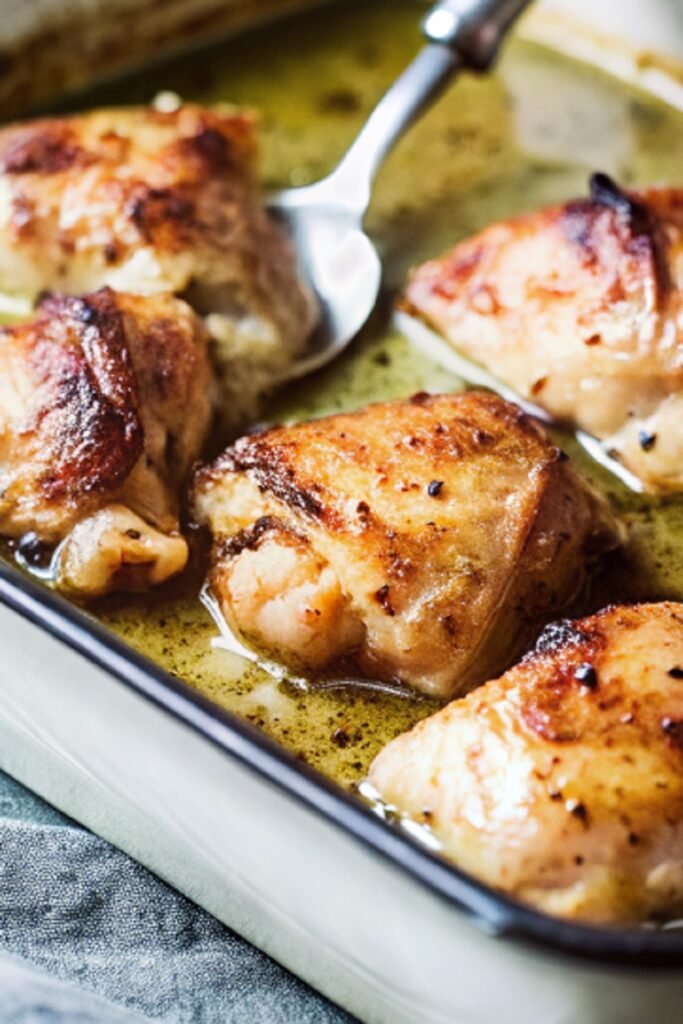 Arrange the chicken thighs skin side up in a single layer. Slide the dish into the oven and roast until the skin turns crisp and deeply golden. This usually takes around 35 to 40 minutes. The juices should run clear, and the chicken should feel tender when pierced.