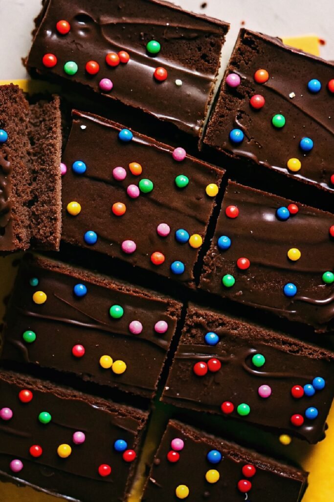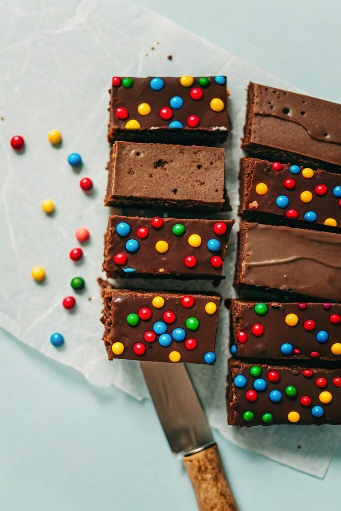 - Add the Topping: Pour the ganache over the cooled brownies and spread evenly. Sprinkle rainbow candy chips on top while the ganache stays soft. Chill until the topping firms up.