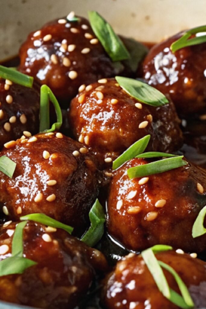 Once the sauce clings nicely to the meatballs, remove the pan from heat. Sprinkle sesame seeds and sliced green onions over the top for a fresh and flavorful finishing touch.
