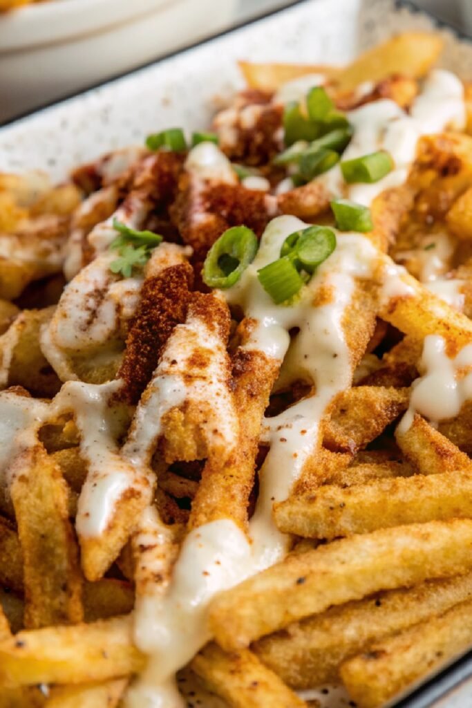 - Finish with Ranch: Remove the fries from the oven and drizzle ranch dressing across the top. Add green onions and any extra toppings you like. Serve right away while everything stays hot and gooey.