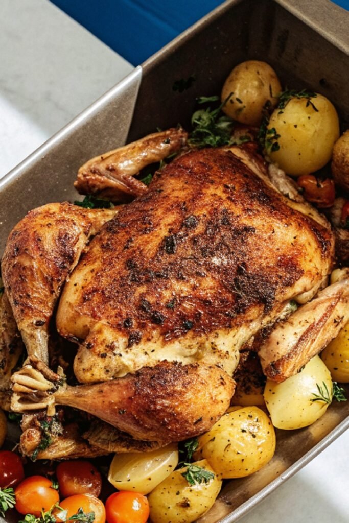 When I serve this for guests, I carve the chicken at the table. The smell always gets everyone’s attention, and the colorful pan makes it feel festive.