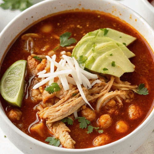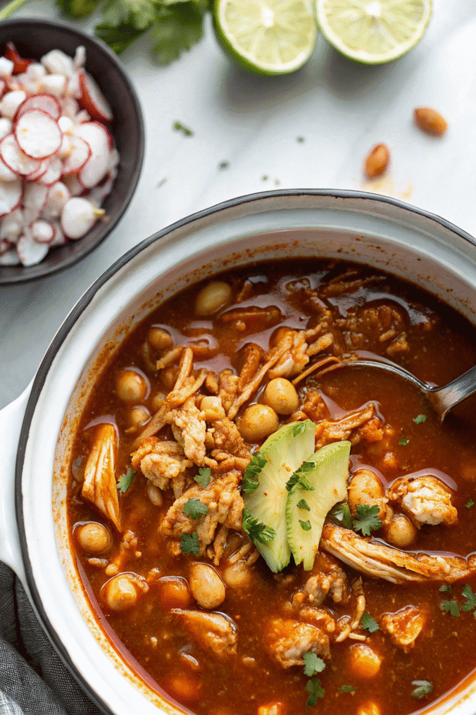 Once the chicken is fully cooked, shred it gently with two forks right inside the pot. Taste and adjust seasoning if needed. Ladle into bowls and top with all your favorite garnishes like cabbage, radishes, and lime juice.