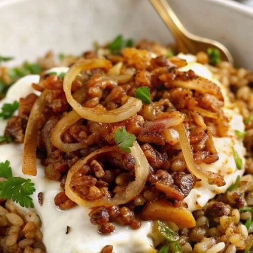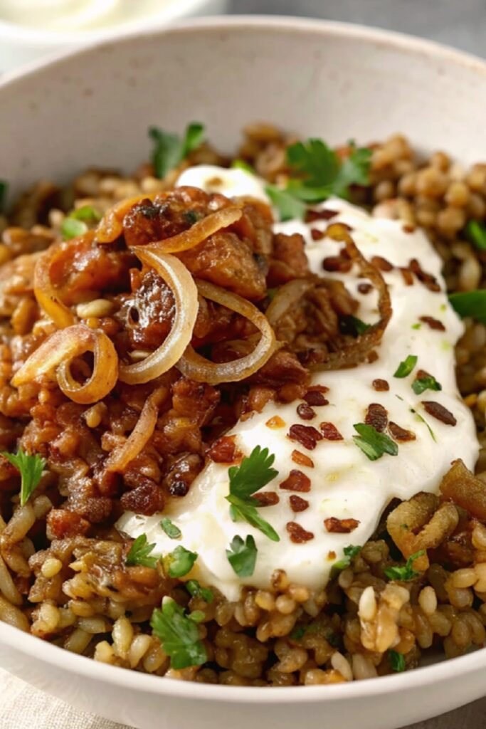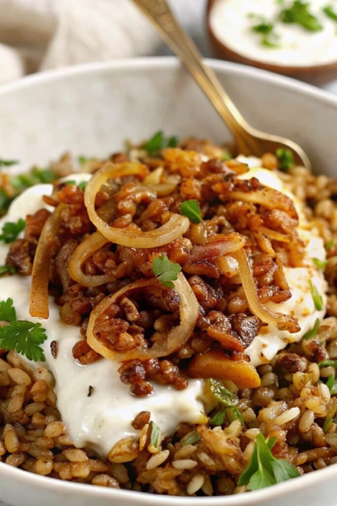 This dish brings together tender lentils, soft rice, and deeply caramelized onions in a way that feels both nourishing and rich.