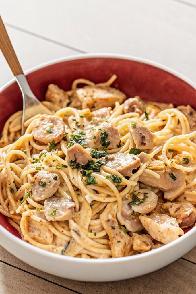 One Pot Chicken Tetrazzini works well as a full meal on its own. Serve it hot with a simple green salad to add freshness. A slice of warm bread on the side helps scoop up extra sauce.