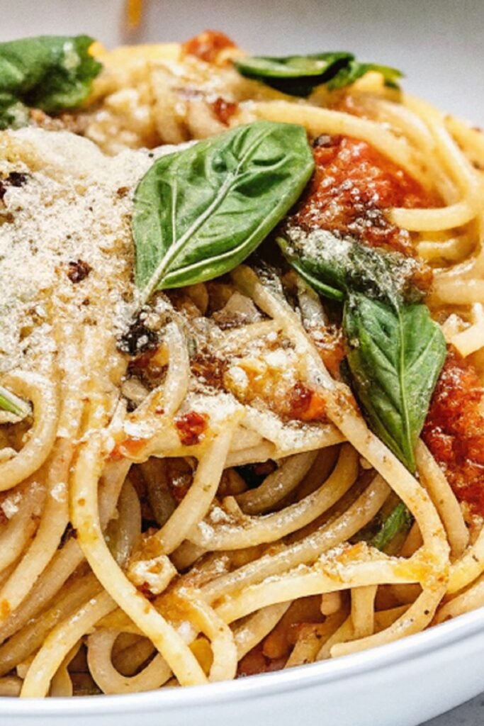 Add the drained spaghetti directly into the sauce. Toss well so every strand gets coated. Add a splash of pasta water if the sauce feels too thick.