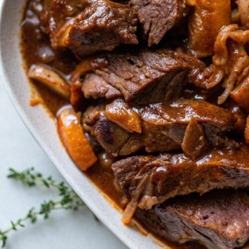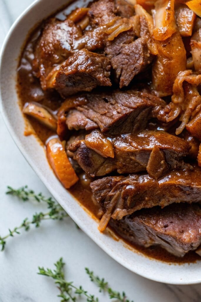 When I serve it for guests, I like to pile the beef onto a large platter, spoon the glossy onions over top, and sprinkle some chopped parsley. It looks simple but impressive. For a cozy meal at home, I just serve it straight from the pot, right on the table, so everyone can help themselves.