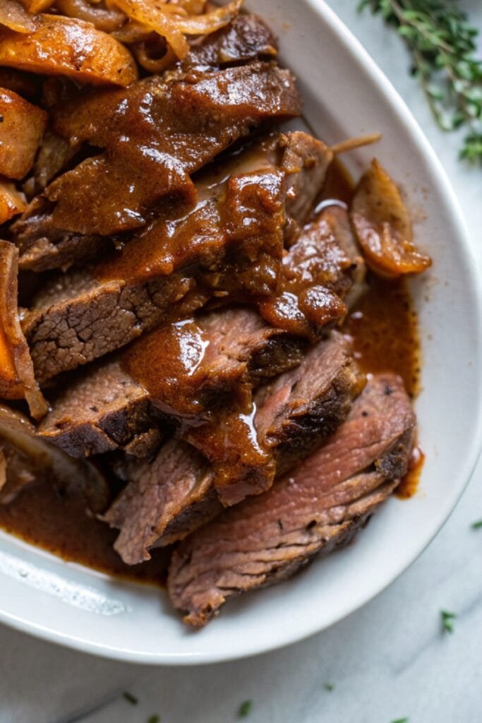 Once done, remove the roast and let it rest for 10 minutes. Skim any excess fat from the top of the sauce, then reduce it slightly on the stove if you want it thicker. Slice or shred the beef and spoon the balsamic onion sauce over top.