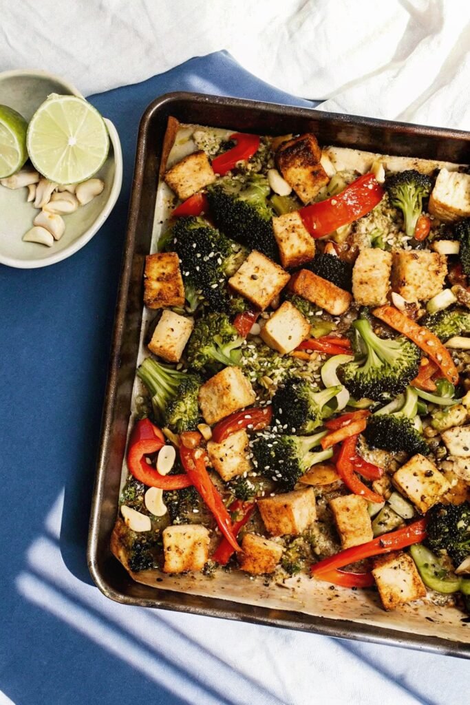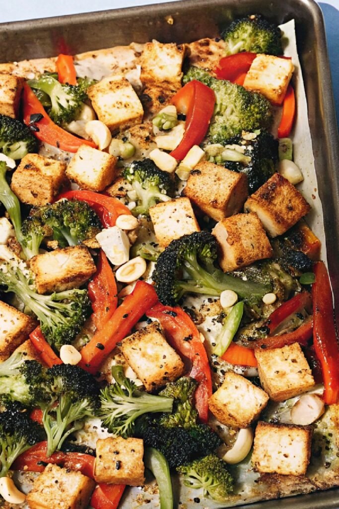 Roast in the oven for 20–25 minutes, stirring halfway through. The tofu should be golden and crispy, and the veggies should be tender but still vibrant. Cashews can be added during the last 5 minutes of baking to toast lightly without burning.
