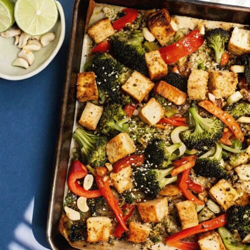 My family loves this Sheet Pan Chinese Cashew Tofu! It’s truly one of our favorite weeknight dinners, with crispy tofu, roasted veggies, and a glossy ginger-garlic sauce tossed with toasted cashews.