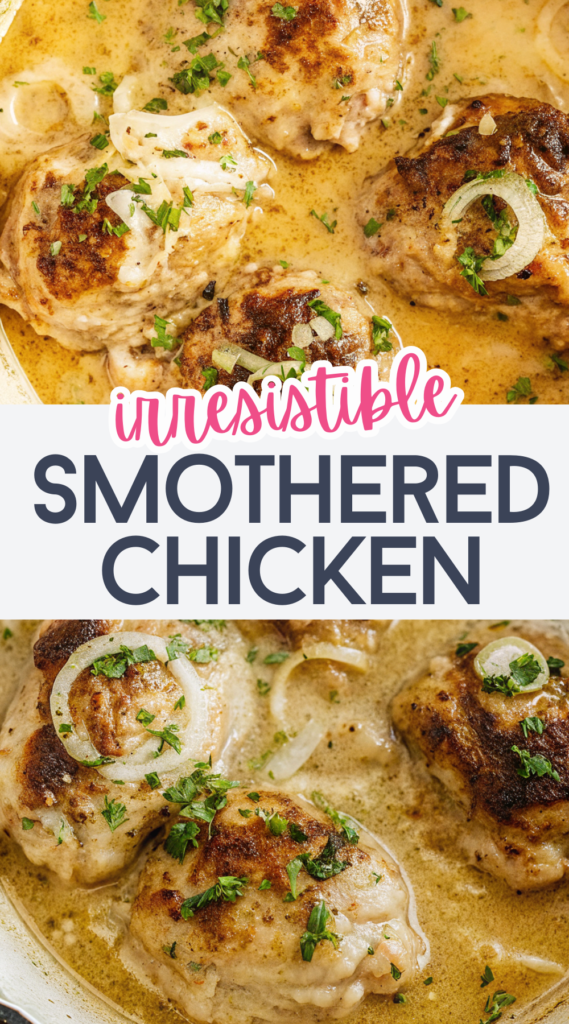 Smothered Chicken pairs perfectly with mashed potatoes, rice, or buttered noodles. The sauce loves something soft to soak into.