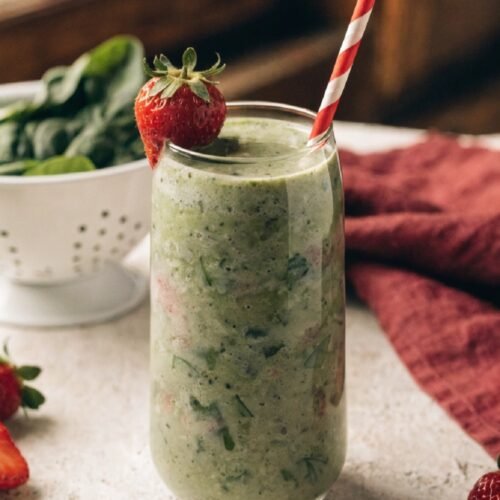 This strawberry spinach smoothie blends fruit and greens into one smooth and tasty drink.