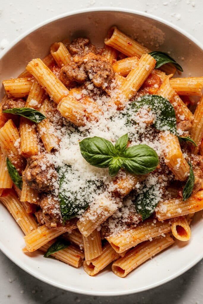 Return the browned sausage to the skillet and stir it into the sauce. Add the cooked pasta and toss everything together, letting it cook for 2–3 minutes so the pasta absorbs the sauce. If it feels too thick, add a splash of the reserved pasta water until it coats the pasta nicely.