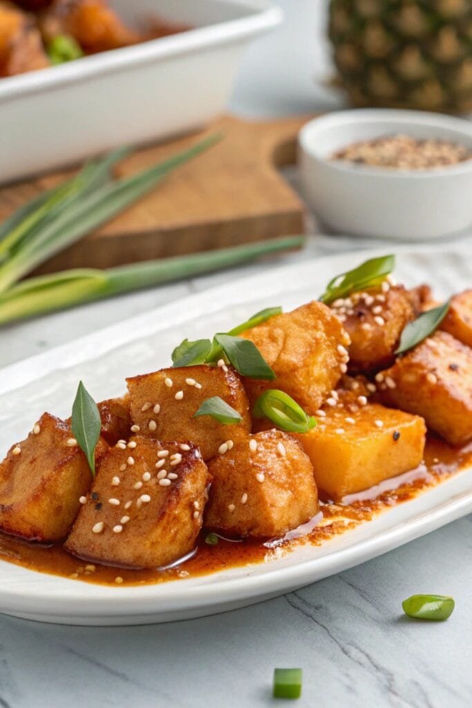 Turn off the heat and top the dish with pineapple chunks, green onions, and sesame seeds if desired. Serve hot over fluffy rice or noodles so that every spoonful soaks up the sauce. The vibrant garnishes make it look just as good as it tastes.