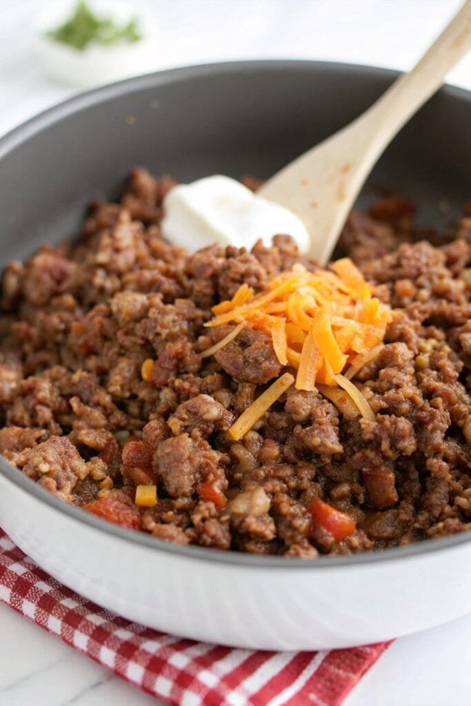 This seasoned meat works as the base for so many dishes. Fill crunchy taco shells or soft tortillas, pile it on nachos with melted cheese and jalapeños, or roll it into burritos with beans and rice. It’s also great inside quesadillas, layered into taco salads, or served in bowls with rice and fresh toppings.