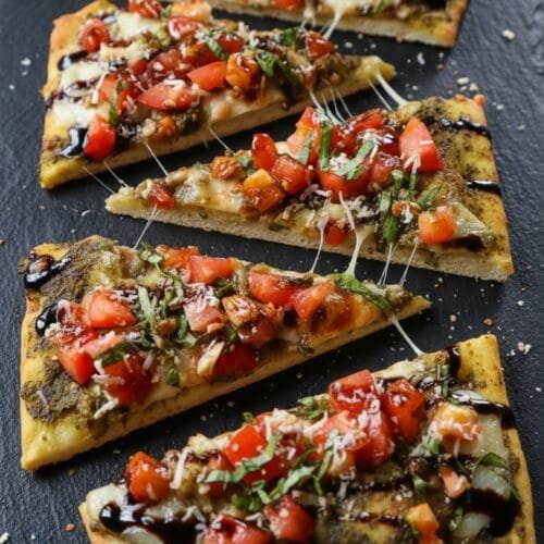 This recipe takes all the freshness of classic bruschetta and layers it onto a warm, crisp flatbread that feels like a mix between pizza night and a cozy appetizer. Instead of just serving bruschetta on slices of bread, the flatbread gives it a heartier base that makes it work as a light dinner or sharable party dish. Juicy tomatoes, garlic, and herbs mingle with melty cheese on a golden crust, creating a dish that’s both rustic and a little fancy at the same time.