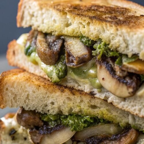 This pesto mushroom sandwich proves that a veggie sandwich can be both comforting and impressive. The crisp bread holds in layers of golden mushrooms, melty cheese, and rich pesto, making every bite satisfying. It’s a recipe that feels casual enough for a quick lunch but still special enough to serve when company comes over.