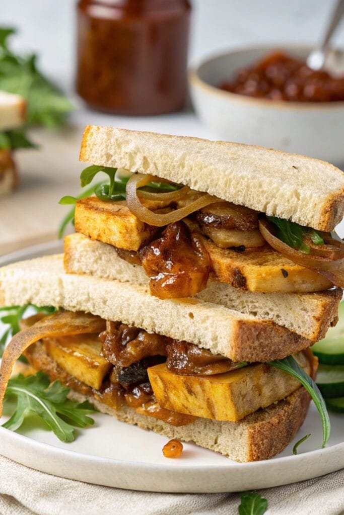 Crispy tofu slices: Pan-seared or baked tofu gives a meaty texture and holds the sandwich together.