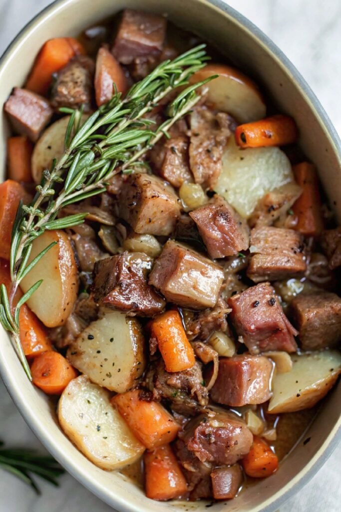 Preheat the oven to 375°F. In a large oven-safe pot, heat olive oil over medium heat. Sauté the diced onion and minced garlic until fragrant and slightly golden. Add the baby carrots and red potato chunks, stirring to coat them in the oil and garlic. Sprinkle in rosemary, thyme, salt, and black pepper. Stir well to distribute the herbs evenly.