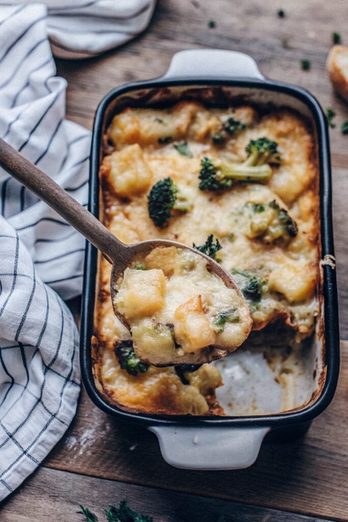 Let the casserole sit for a few minutes so the sauce settles. The flavors come together nicely after resting, and the first scoop comes out creamy and packed with broccoli and potato.