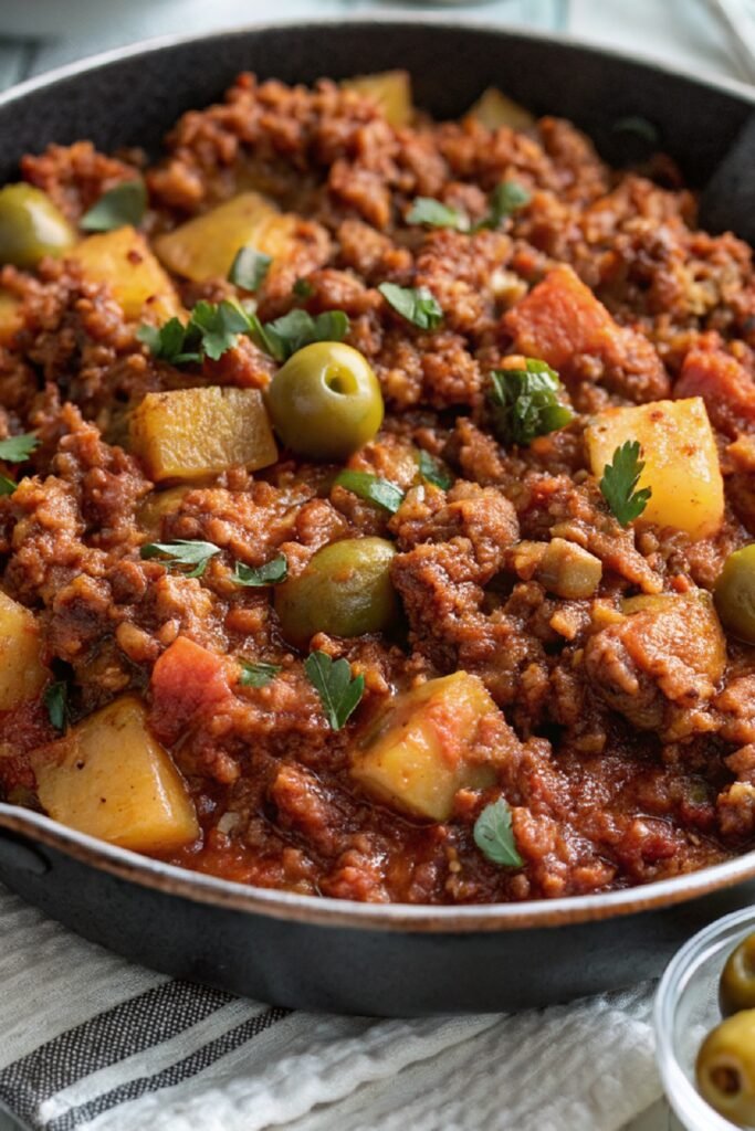Let the picadillo simmer gently until the potatoes turn soft, and the sauce becomes thicker and richer. Add the olives near the end so they warm through without losing their bite.