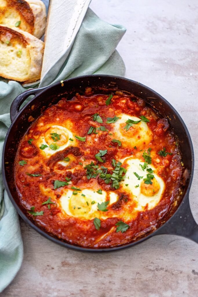 This shakshuka pairs well with warm pita, toasted sourdough, or even soft flatbread. It also sits nicely next to roasted potatoes, a light cucumber salad, or simple rice. When I make it for a cozy brunch, I serve it with olives, avocado slices, and a bowl of fresh fruit. The warm tomato base works with so many small sides and turns into a complete meal with almost no effort.
