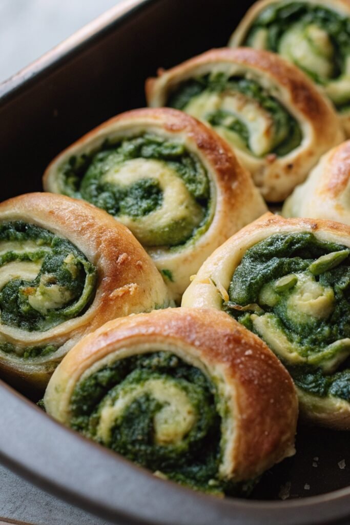 Roll the dough into a rectangle on a floured surface. Spread the spinach mixture evenly over the dough. Carefully roll it up tightly, then slice into 8–10 rolls. Place rolls in a greased baking dish, leaving a little space between each. Cover and let rise for 15 minutes.